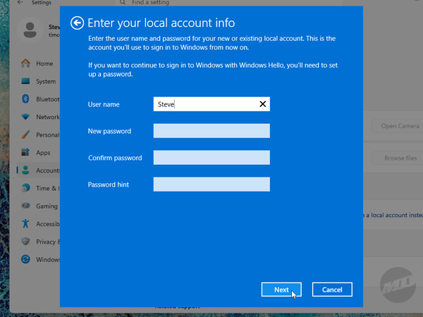 2 Enter a user name and enjoy a local account like it's 1995.