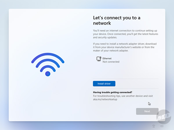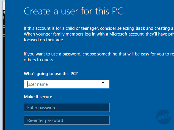 Enter your user name and an optional password, circumventing Microsoft's giant, unlubricated colonoscope. Windows Setup will continue to install and you can connect to the internet once you're at the desktop.