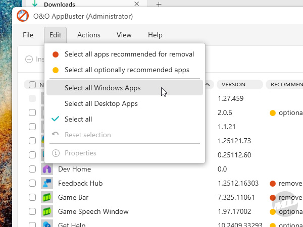Once AppBuster has displayed the entire list of installed apps, click on the Edit menu and select "Select all Windows Apps." This will automatically check all of the spyware, bloatware, and apps infested with AI included with Windows. It won't pick anything outside of the Microsoft metaverse, so you might want to also select some of the extra junk that came from the device manufacturer. Browse the list and add anything else you want removed.
