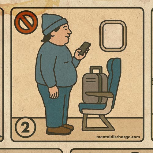 We've got a destination to be late to, so sit your ass down. Stop standing in the aisle, quit digging through your bag, store your belongings either overhead or underneath the seat in front of you, and immediately plant yourself in that little blue chair.