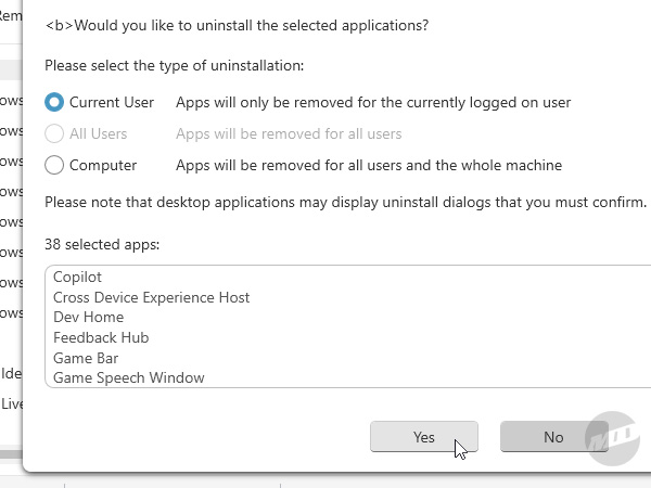 AppBuster will now ask you how you'd like these items removed. I recommend leaving "Current User" selected. After clicking "Yes" to confirm, you can choose to create a Restore Point in case things go awry, then watch the magic happen as AppBuster goes through and gives Windows a much-needed enema.