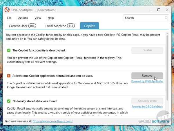 O&O Software offers another great utility called ShutUp10++ that allows you to disable Copilot, unwanted access to hardware and files, location sharing, data collection, transmission of weird habits you're into, and much more.