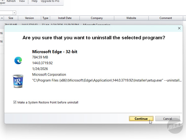 You'll be warned that removing Edge may cause some Windows features or other software to not work correctly, but you've run out of fucks to give. Click "OK" to be presented with another screen that'll give you the option to create a Restore Point before you continue.