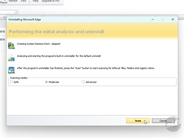 Revo Uninstaller will give you three choices on how to proceed. This determines how deep you want it to go in removing anything that survives the initial uninstall. Since Edge doesn't have a true, actual uninstaller, registry entries and file locations will be targeted immediately. Moderate is fine and already selected, but you can go Advanced if you like. Click "Scan" to begin the hunt.