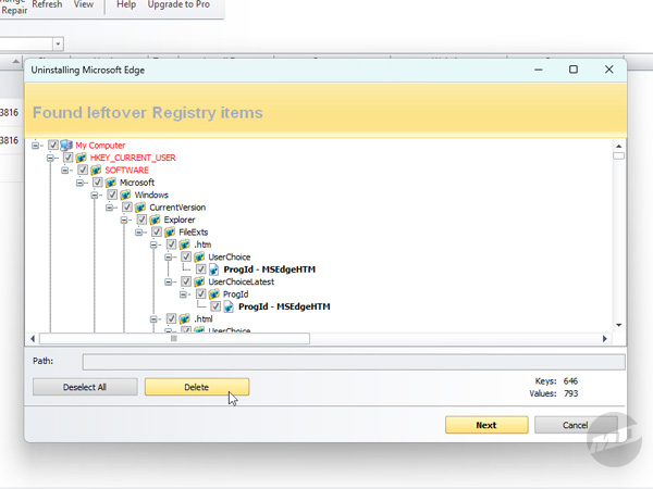 The next screen will show the resulting registry entries associated with Edge that can be deleted. These are what embed Edge into Windows, not unlike a gut organism after a week of Indian street food. Click "Select All" if the entries aren't already selected, then click "Delete" to proceed. Once the registry items are wiped from existence, Revo Uninstaller will take you to the last step. Clicking "Next" shouldn't be necessary here.