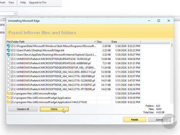 The last stop on this magical journey is a laundry list of the files associated with Edge. Again, click "Select All" if the files aren't already selected, then click "Delete" to remove the files. Don't fret if you still see some listed as these will require a reboot to get fully removed. Click "Finish," close Revo Uninstaller, restart your machine, and they'll be dealt with quietly and efficiently.